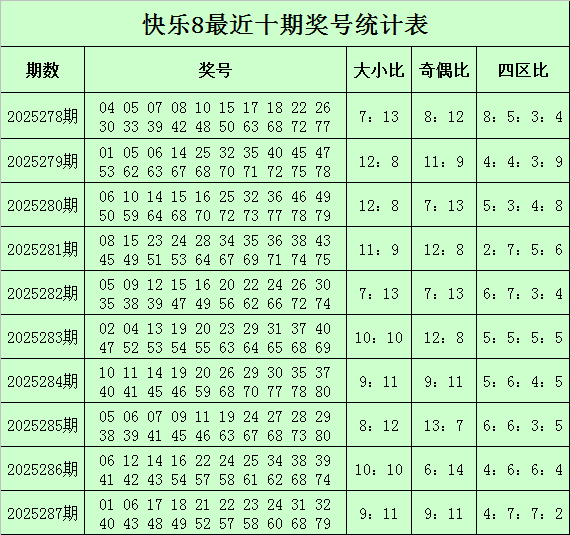 福彩餍足8第2025287期开奖回归:01 06 17 18 21 22 23 24 31 32 40 43 48 49 52 57 58 60 68 79体育集锦,其中奖号四区比为4:7:7:2,奇偶比为9:11,大小比为9:11。
