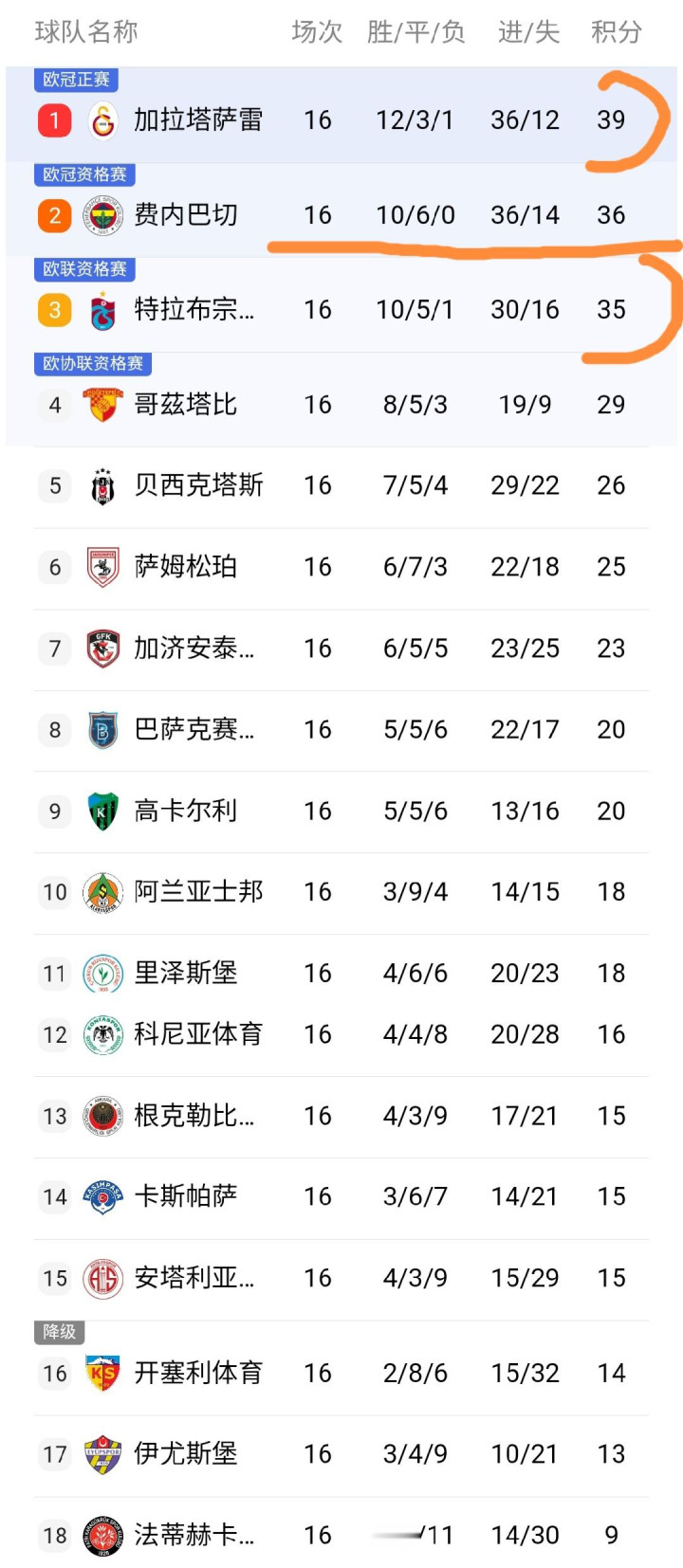 16轮之后的土超积分榜: