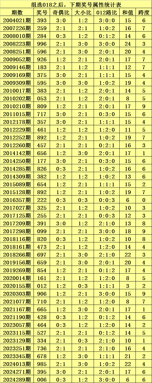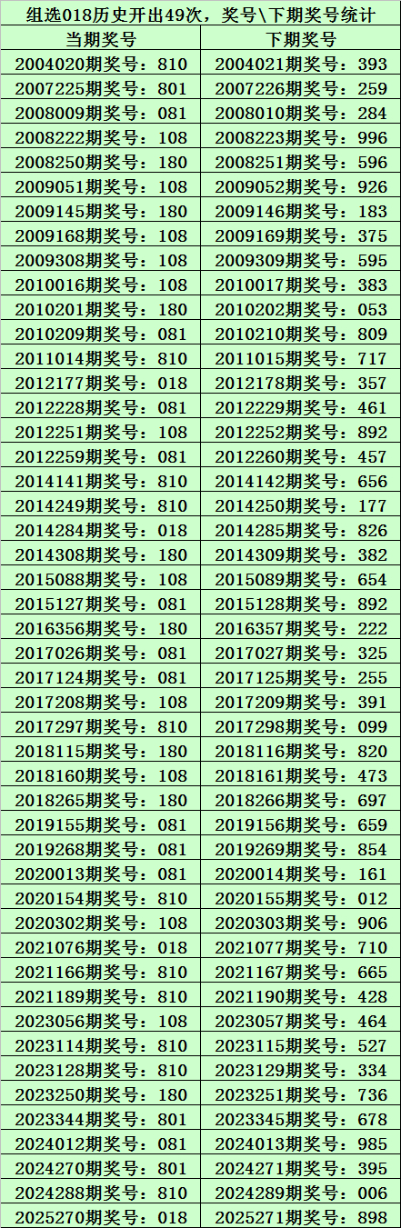 二、组选018分析:摆设三历史上已开出49次组选号码018了,其奖号和下期开出奖号统计如下: